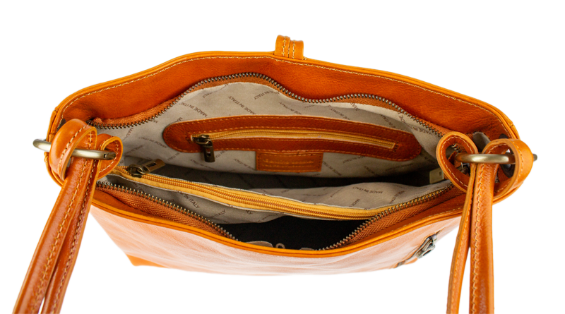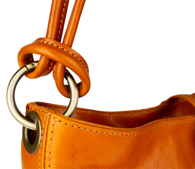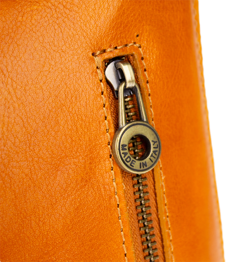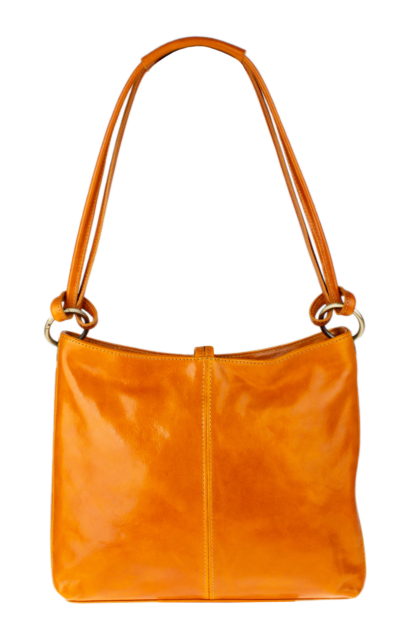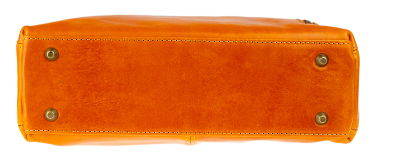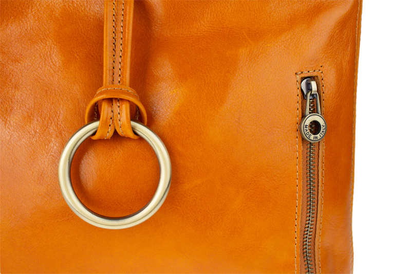 Hořčicová středně velká kabelka klasického designu nositelná přes rameno. Na boku najdeme vertikální kapsu na zip. Tato kožená kabelka je uzavíratelní na zip a dále disponuje také ozdobou – kroužkem, který se překlápí přes zip a drží tak kabelku také zavřenou. Hloubka jejího dna je 9 cm.