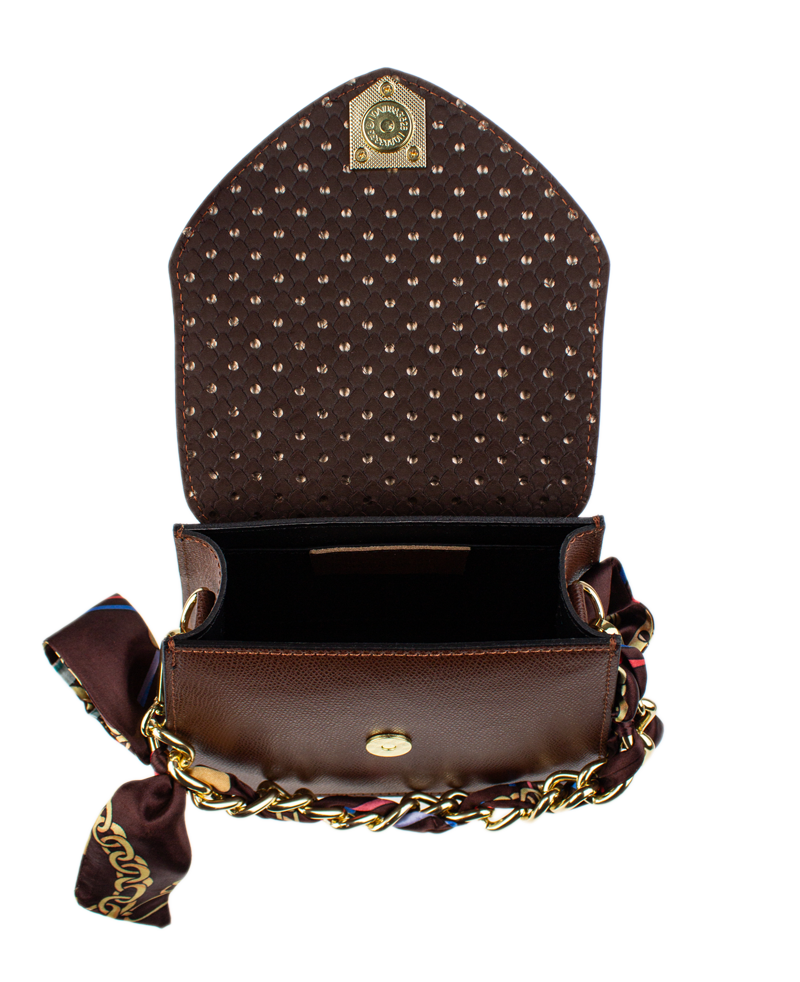 Malá šikovná kabelka se zajímavým tvarem. Kabelka je vyrobená z pravé kůže, která velice dobře drží svůj tvar. Je vhodná na nošení přes rameno nebo cross-body (křížem).