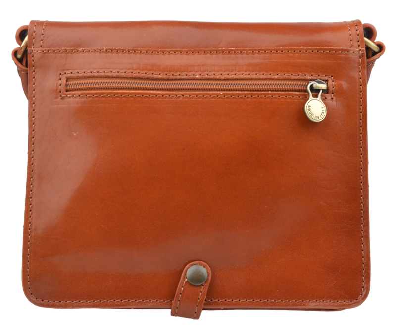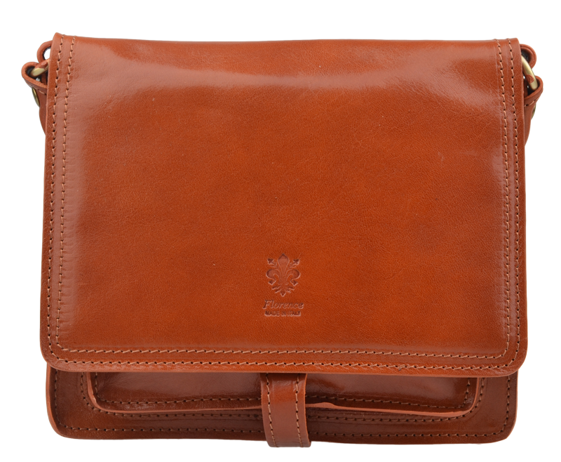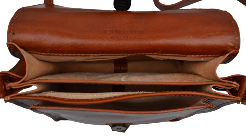 Kožená kabelka v hnědé barvě. Kabelka se uzavírá pomocí poklopu na patentky. Uvnitř kabelky jsou tři přihrádky. Délka popruhu je 130 cm.