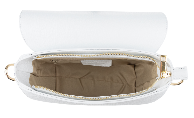 Bílá kabelka nositelná přes rameno či cross-body (křížem). Tato kožená kabelka je uzavíratelná na patentku a uvnitř nalezneme přihrádku na zip. Kabelka má nastavitelný popruh s maximální délkou cca 140cm.