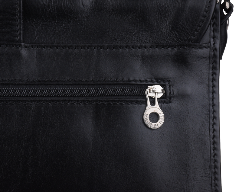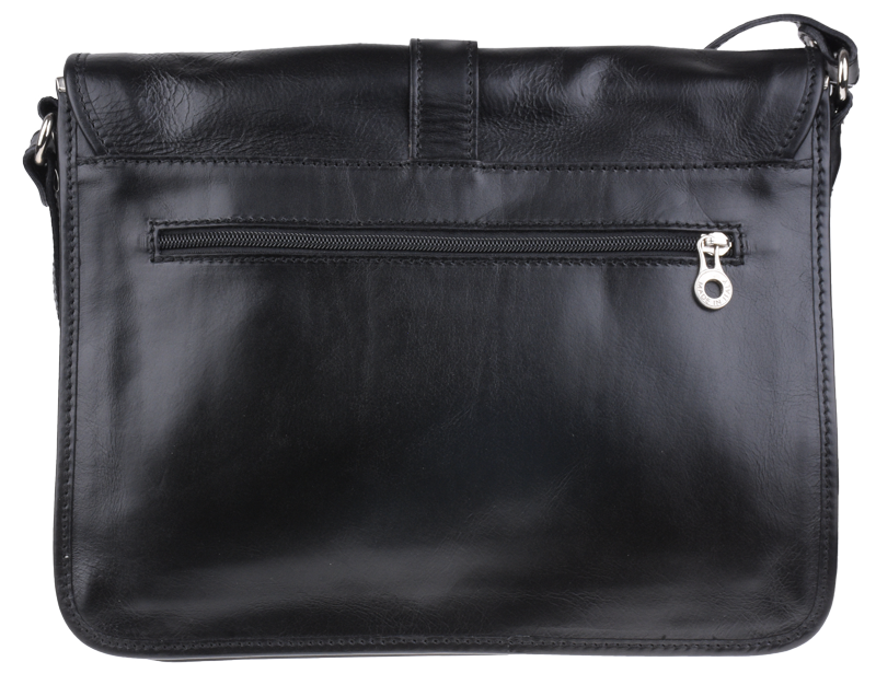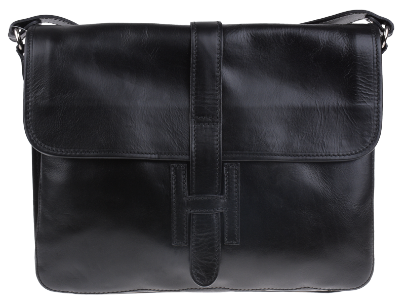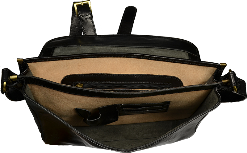 Nádherná kožená vintage kabelka v černé barvě s jedinečným nápaditým zapínáním. Vnitřek kabelky je rozdělen na dvě části a disponuje malou kapsou na zip a koženými doplňky na uchycení psacích potřeb.