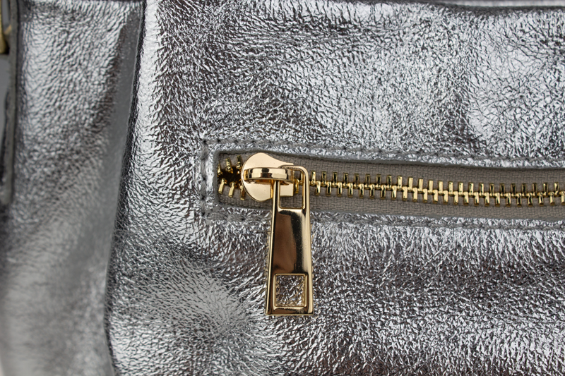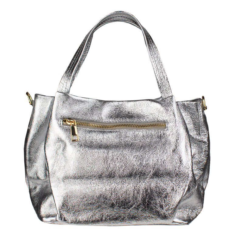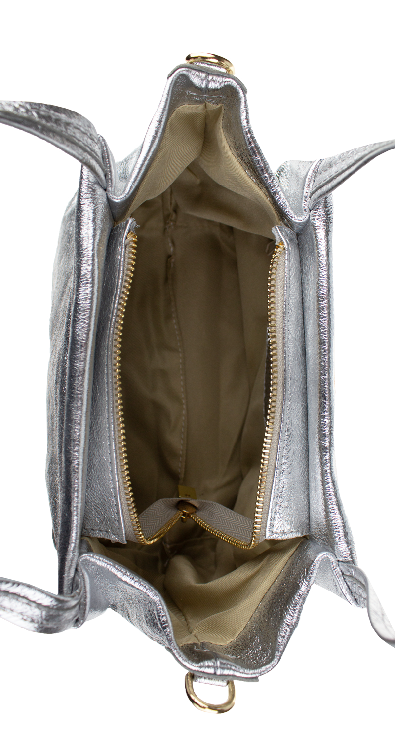 Elegantní a praktická stříbrná kabelka nositelná cross-body (křížem) nebo v ruce. Tato kožená kabelka je uzavíratelná na zip. Uvnitř kabelky najdeme na boční stěně kapsu na zip a přihrádky pro mobil či klíče. Hloubka jejího dna je 13 cm. Kabelka má navíc nastavitelný popruh s maximální délkou cca 120 cm.