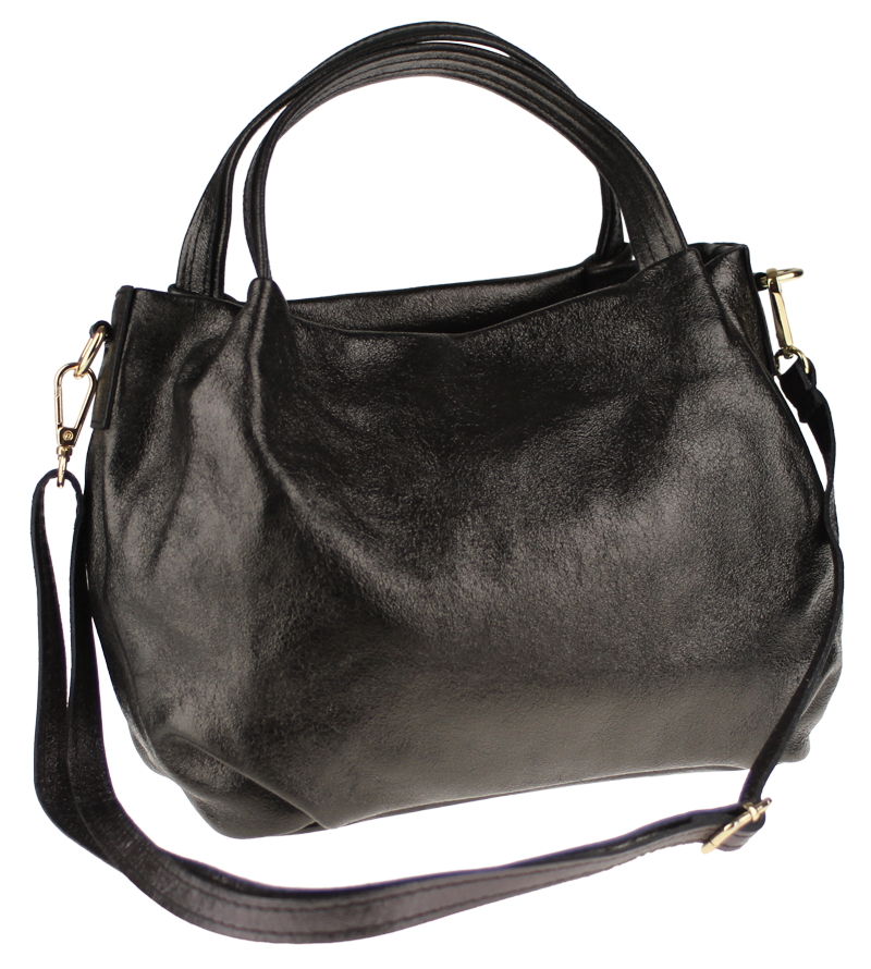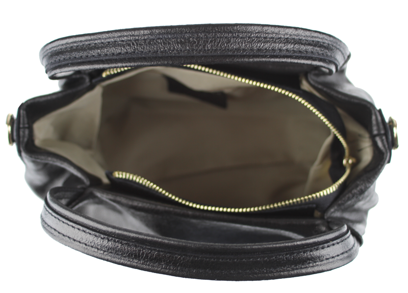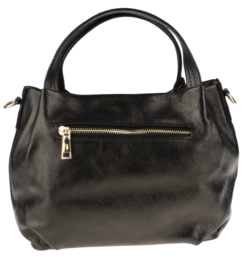 Elegantní a praktická lesklá černá kabelka nositelná cross-body (křížem) nebo v ruce. Tato kožená kabelka je uzavíratelná na zip. Uvnitř kabelky najdeme na boční stěně kapsu na zip a přihrádky pro mobil či klíče. Hloubka jejího dna je 13 cm. Kabelka má navíc nastavitelný popruh s maximální délkou cca 120 cm.