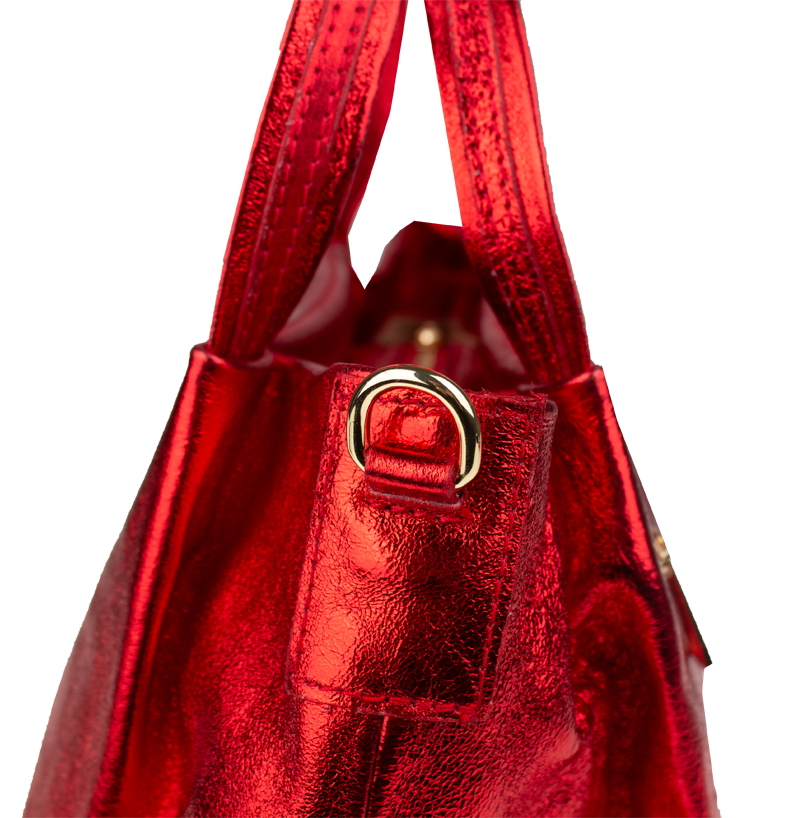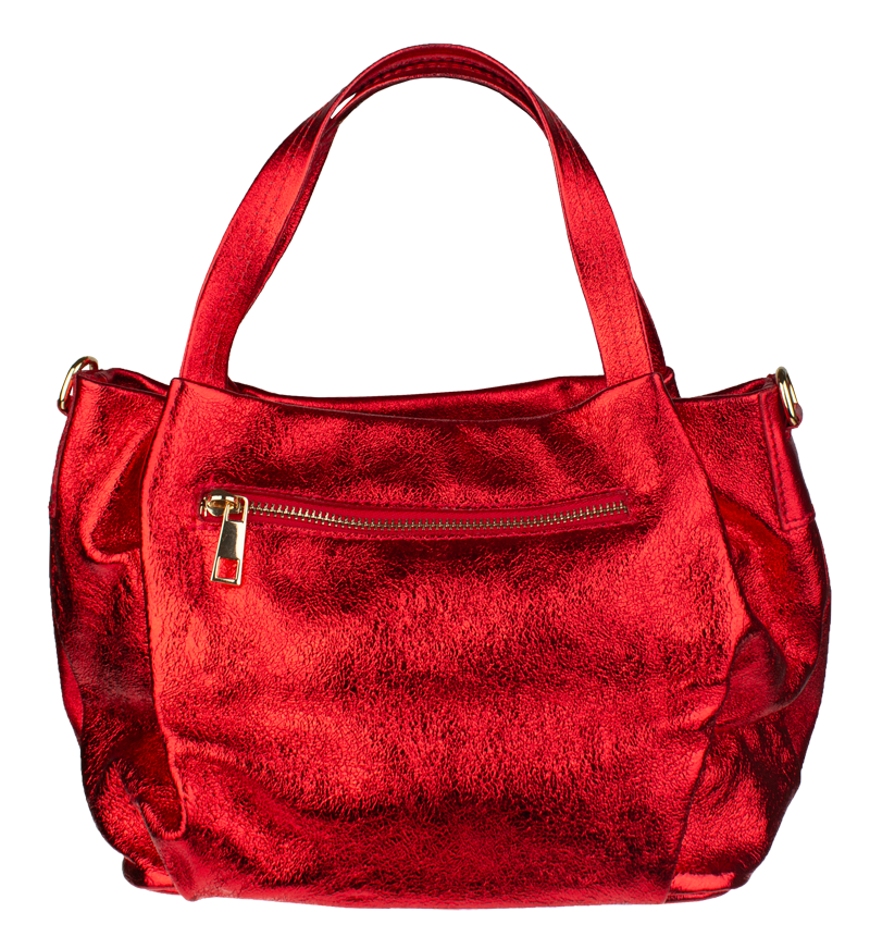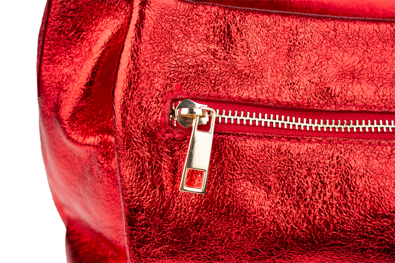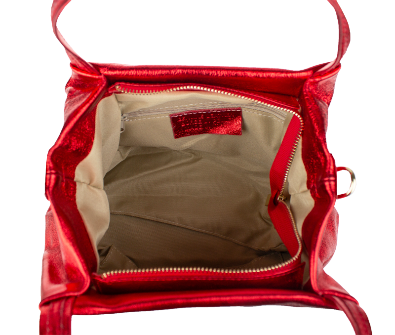 Elegantní a praktická metalicky – červená kabelka nositelná cross-body (křížem) nebo v ruce. Tato kožená kabelka je uzavíratelná na zip. Uvnitř kabelky najdeme na boční stěně kapsu na zip a přihrádky pro mobil či klíče. Hloubka jejího dna je 13 cm. Kabelka má navíc nastavitelný popruh s maximální délkou cca 120 cm.