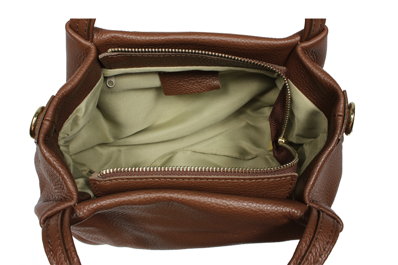 Elegantní a praktická hnědá kabelka nositelná cross-body (křížem) nebo v ruce. Tato kožená kabelka je uzavíratelná na zip. Uvnitř kabelky najdeme na boční stěně kapsu na zip a přihrádky pro mobil či klíče. Hloubka jejího dna je 13 cm. Kabelka má navíc nastavitelný popruh s maximální délkou cca 120 cm.