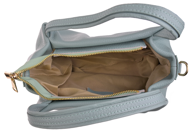 Elegantní a praktická mentolová kabelka nositelná cross-body (křížem) nebo v ruce. Tato kožená kabelka je uzavíratelná na zip. Uvnitř kabelky najdeme na boční stěně kapsu na zip a přihrádky pro mobil či klíče. Hloubka jejího dna je 13 cm. Kabelka má navíc nastavitelný popruh s maximální délkou cca 120 cm.
