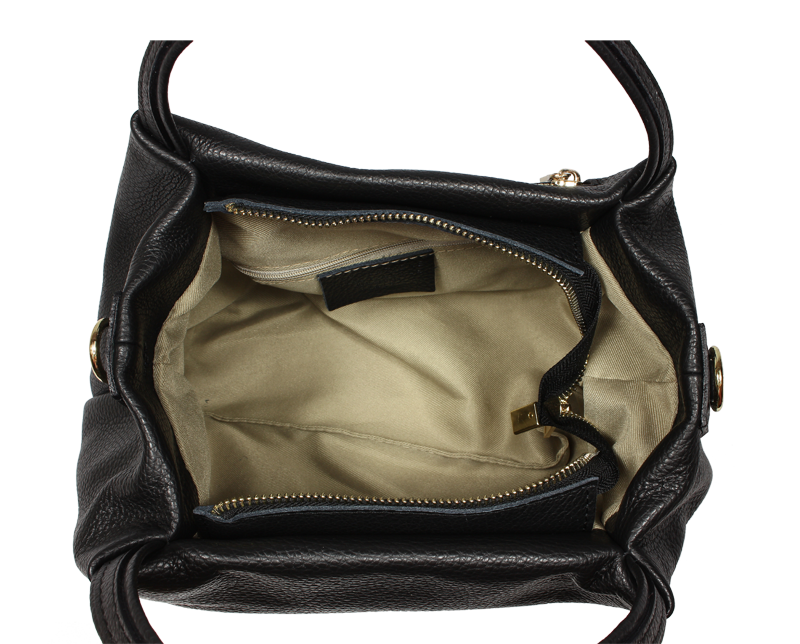 Elegantní a praktická černá kabelka nositelná cross-body (křížem) nebo v ruce. Tato kožená kabelka je uzavíratelná na zip. Uvnitř kabelky najdeme na boční stěně kapsu na zip a přihrádky pro mobil či klíče. Hloubka jejího dna je 13 cm. Kabelka má navíc nastavitelný popruh s maximální délkou cca 120 cm.
