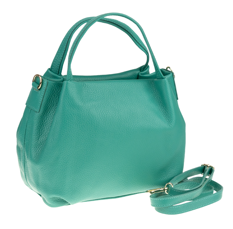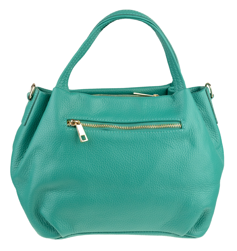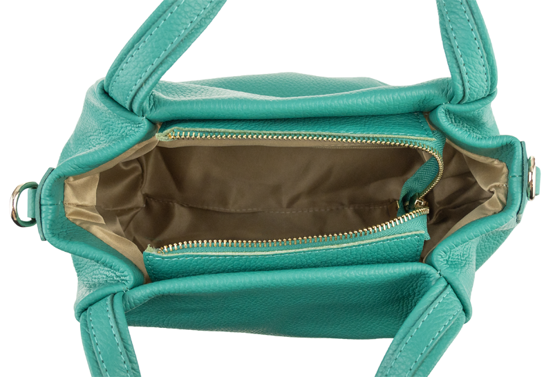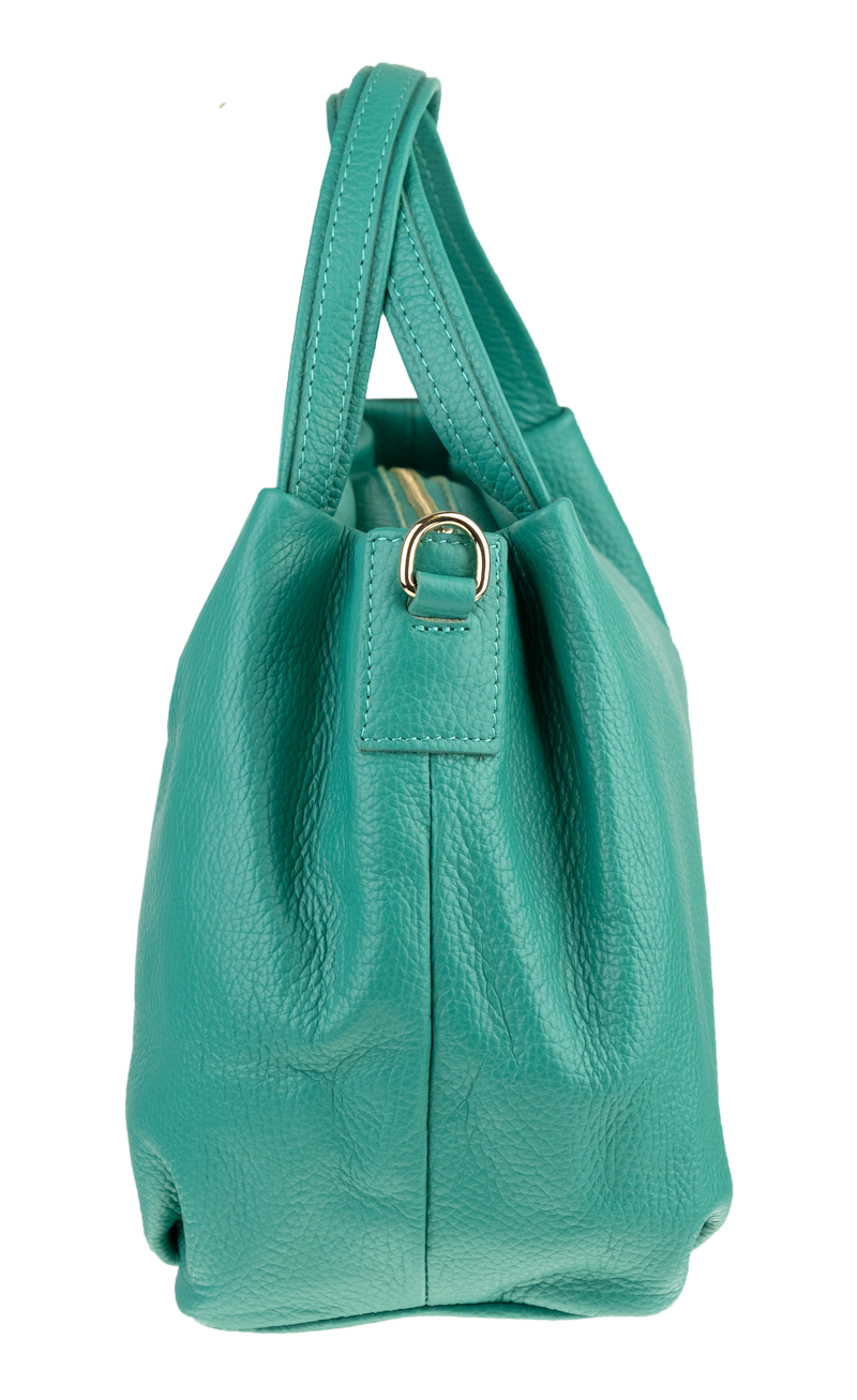 Elegantní a praktická tyrkysová kabelka nositelná cross-body (křížem) nebo v ruce. Tato kožená kabelka je uzavíratelná na zip. Uvnitř kabelky najdeme na boční stěně kapsu na zip a přihrádky pro mobil či klíče. Hloubka jejího dna je 13 cm. Kabelka má navíc nastavitelný popruh s maximální délkou cca 120 cm.