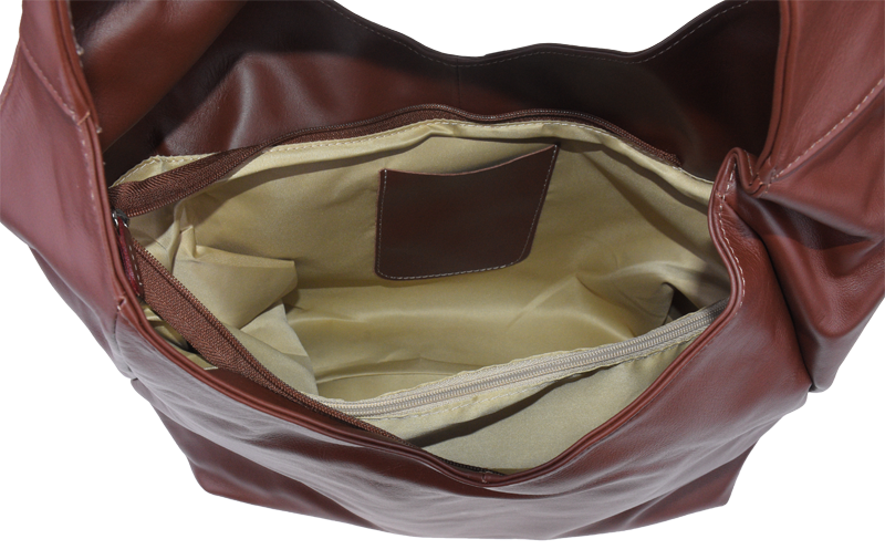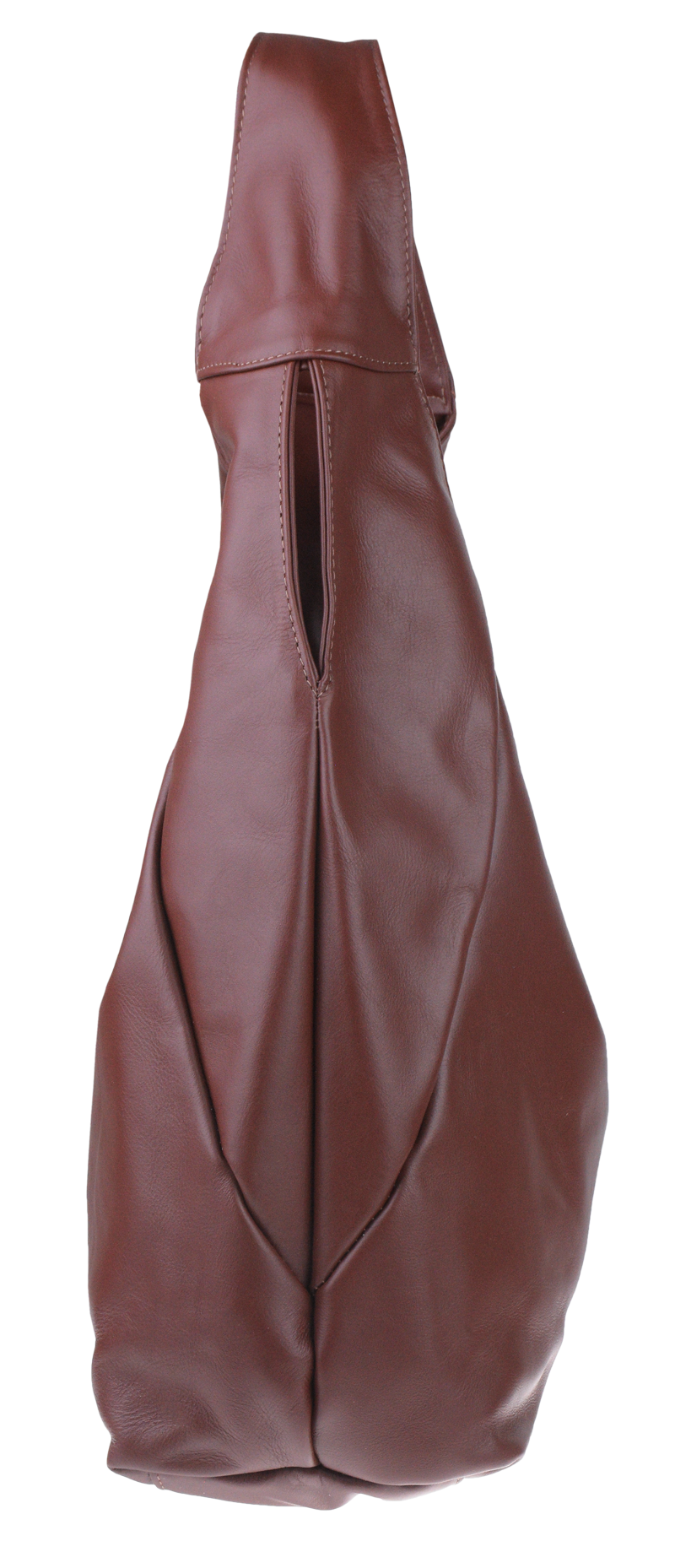 Celistvá elastická kabelka hnědé barvy, moderního designu a oblého tvaru. Kabelka je vyrobena z přírodně barvené kůže. Nosí se přes rameno a je uzavíratelná na zip. Uvnitř kabelky najdeme přepážku uprostřed, která zároveň slouží jako kapsa na zip, a na bočních stěnách pak kapsu na zip a na druhé straně další malou kapsu.