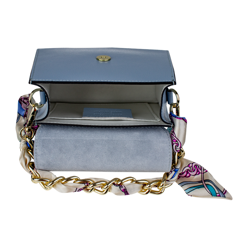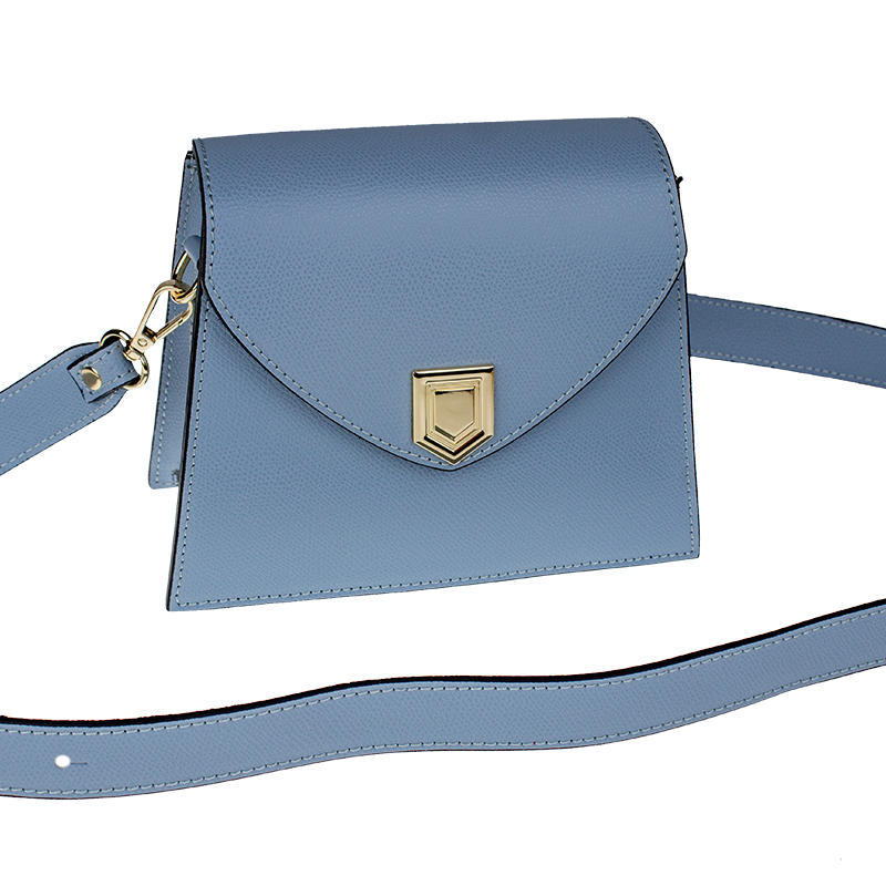 Malá šikovná kabelka se zajímavým tvarem. Kabelka je vyrobená z pravé kůže, která velice dobře drží svůj tvar. Je vhodná na nošení přes rameno nebo cross-body (křížem).