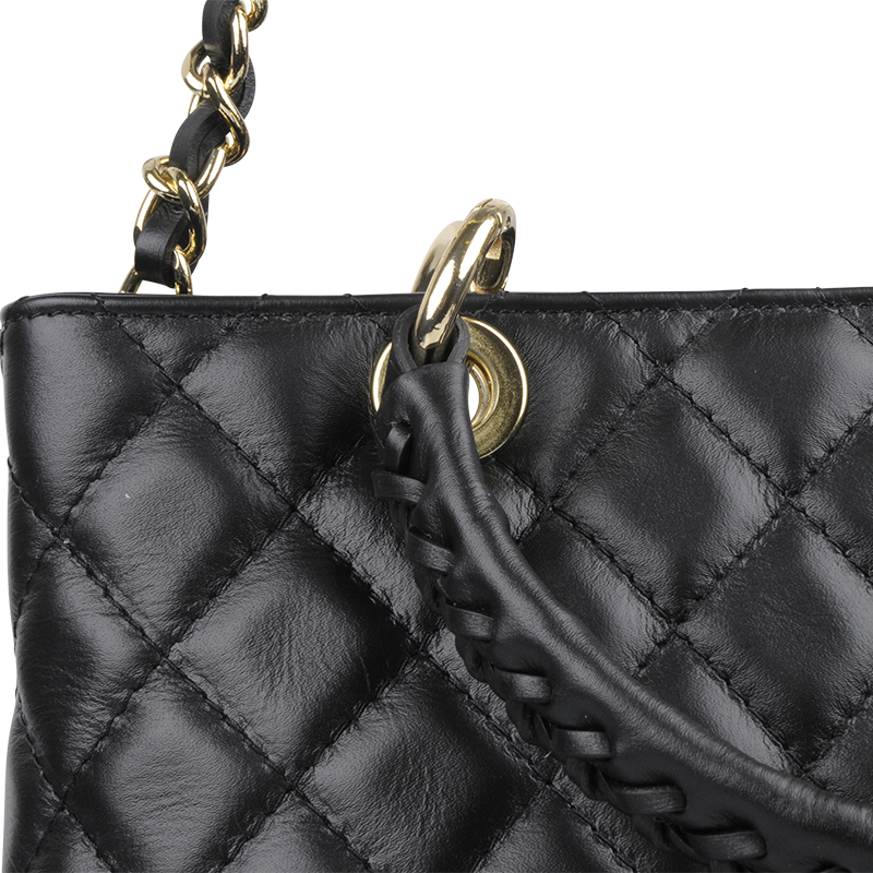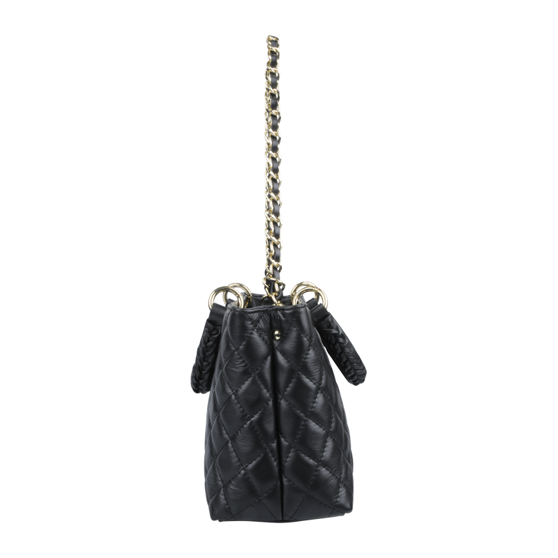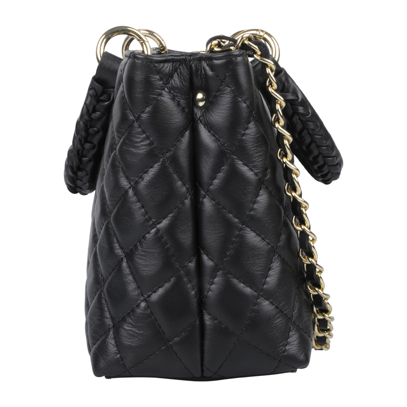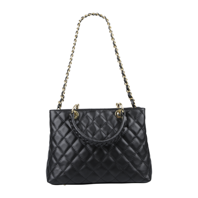 Kabelka je vybavena pevnými pletenými koženými uchy pro nošení v ruce a elegantním zlatým řetězem pro nošení přes rameno nebo crossbody. Kovové detaily ve zlatém tónu podtrhují luxusní vzhled.